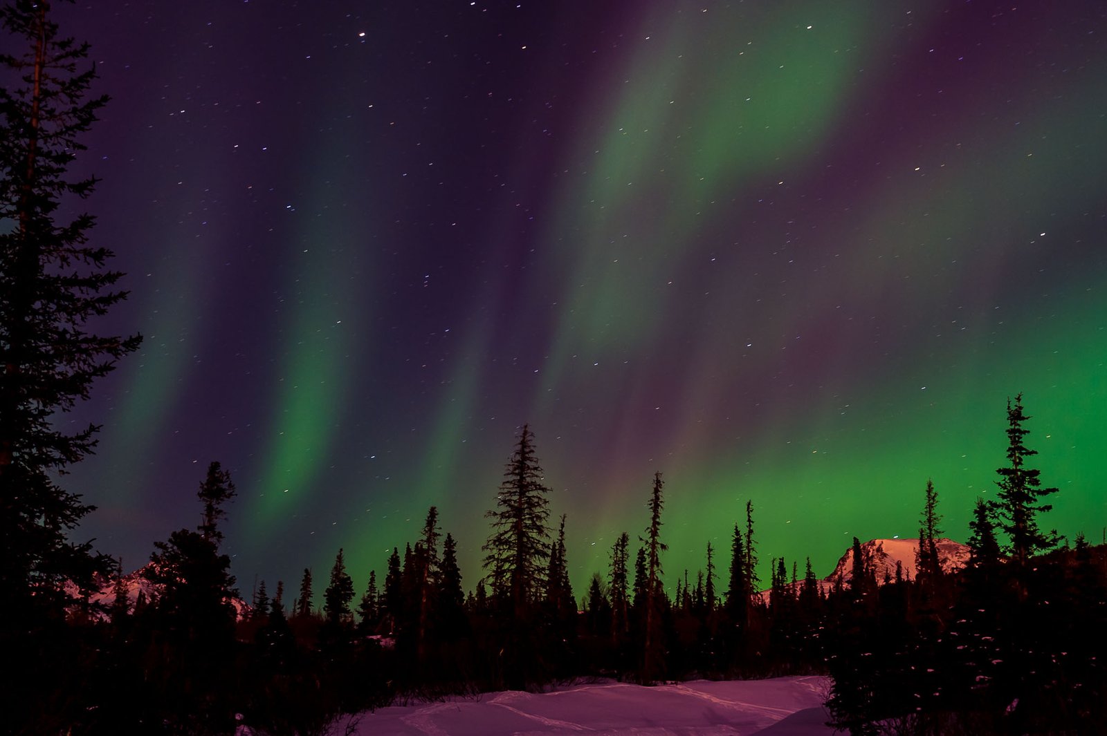 But this year was different. Towards the end of the race, there were reports of a massive solar flare-up which should produce some great northern lights. The race was almost over and my work load had dwindled down to monitoring the progress of only 2-3 mushers still on the trail. I decided that the night of March 17 would be the perfect night to get out of town in search of the forecasted aurora. First we headed down Turnagain Arm with no success. Then we decided to head up to the Flat Top trailhead in the Chugach Mountains outside of Anchorage. That’s where we remained and witnessed the most awe inspiring night of dancing lights I’ve ever seen. It was cold, there were people everywhere, and cars driving into the area with their headlights on, but eventually I was able to capture some decent photos of the aurora. Now I’m hooked and want to go back for more.